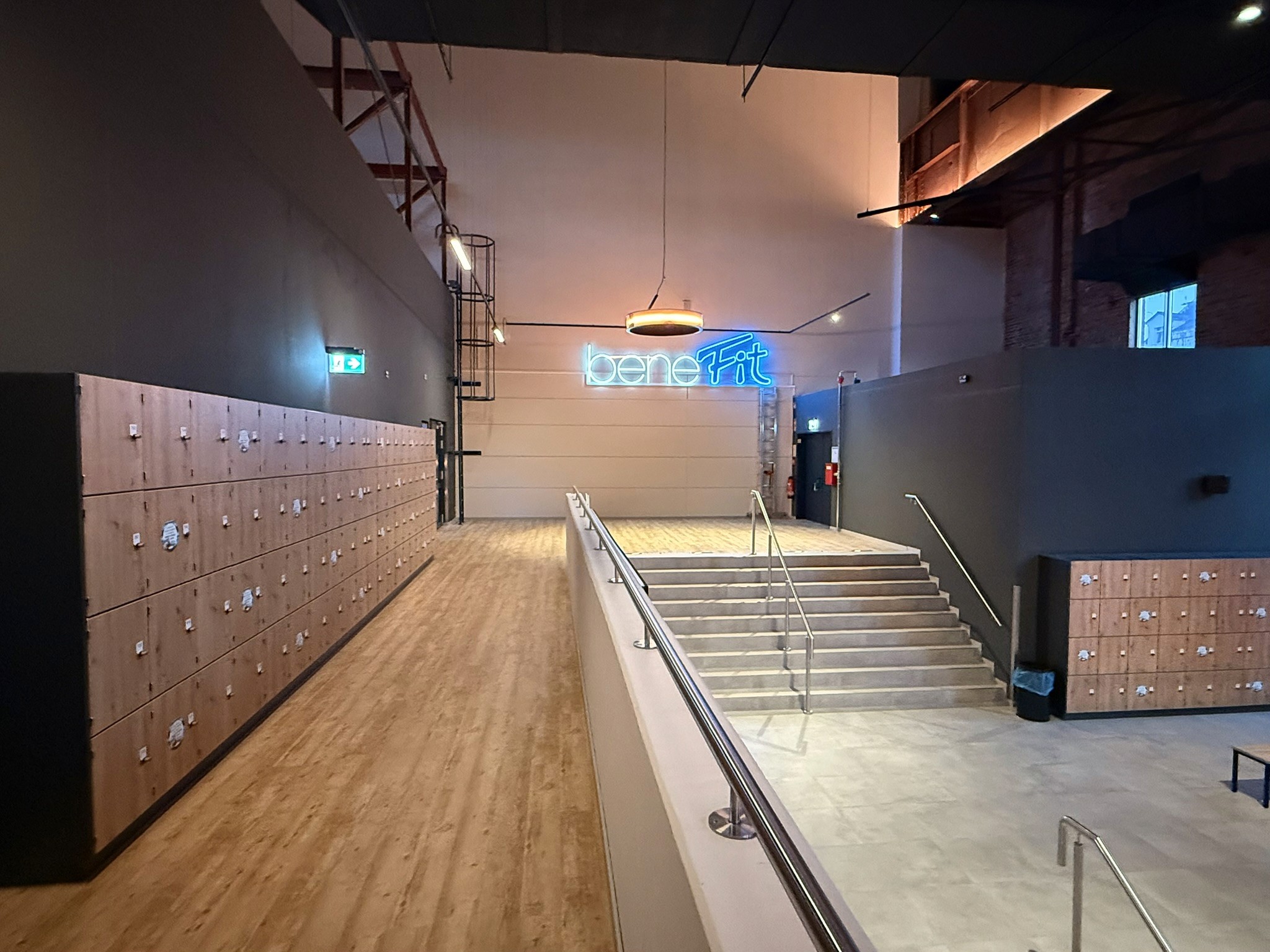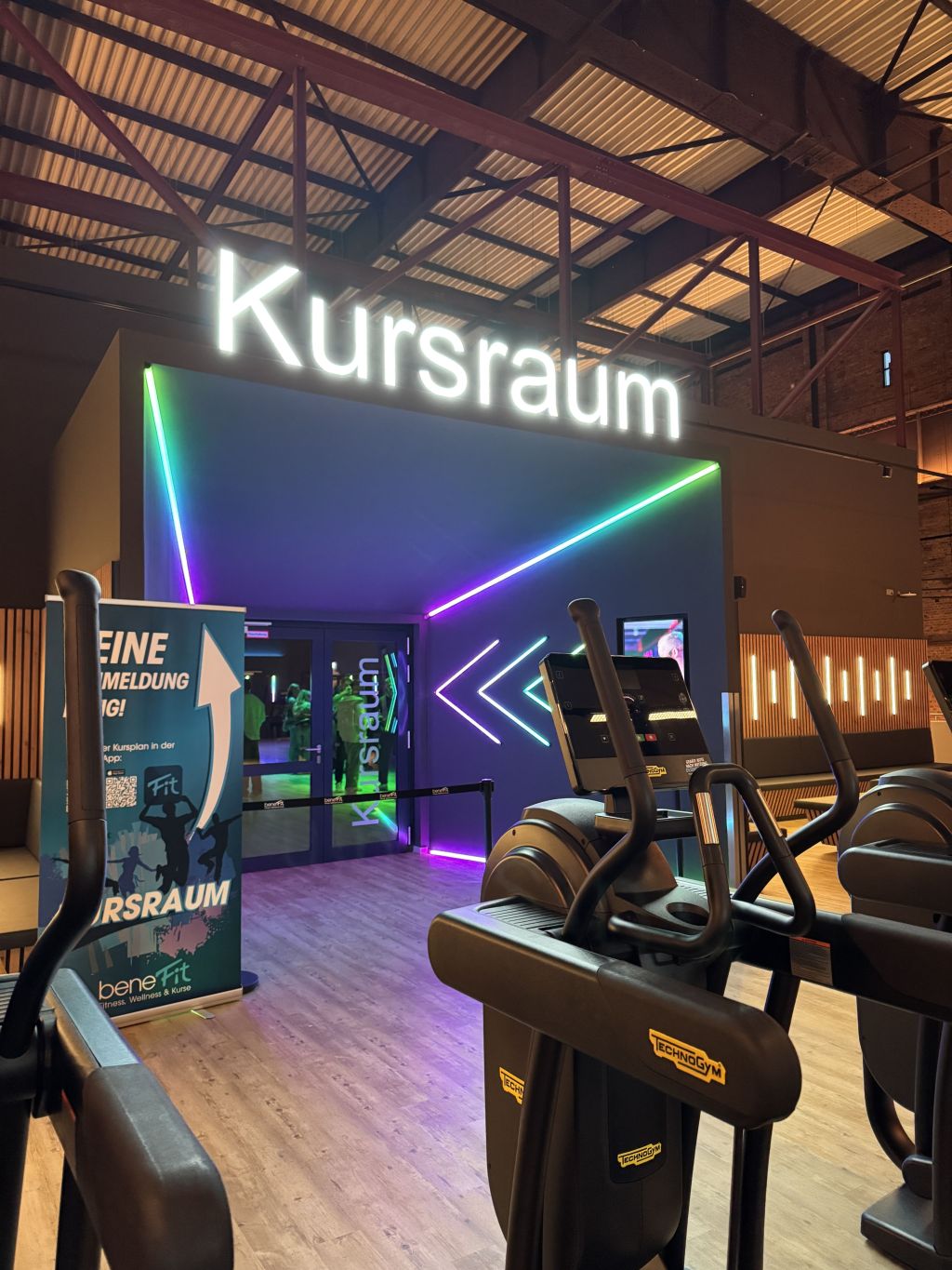 Mehr als ein Dutzend Neon-Schilder wurden über die gesamte Halle hinweg verteilt. Sie dienen nicht nur als visuelle Highlights, sondern schaffen Orientierung, Markenidentität und Instagram-würdige Spots – ohne dabei den industriellen Stil zu brechen.Kursraum mit eigener Identität: