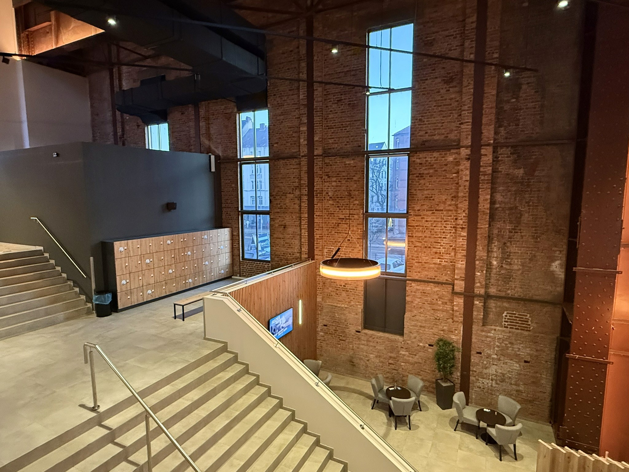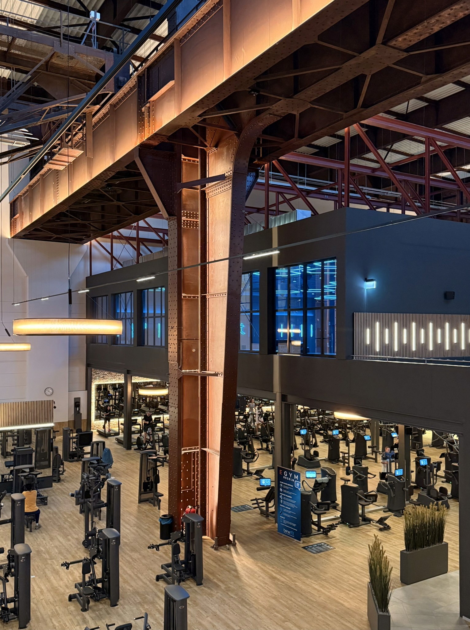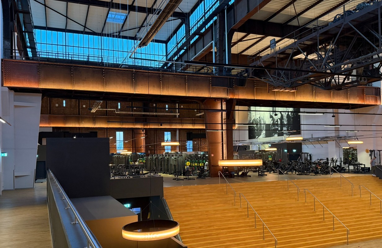 Industriecharme trifft Atmosphäre: Auf 4.500 m² Hauptfläche und einem 450 m² großen Kursraum entstand eine Umgebung, in der Klang, Licht und Raumgestaltung aufeinander abgestimmt wirken – trotz enormer Höhen, akustischer Herausforderungen und paralleler Gewerke.